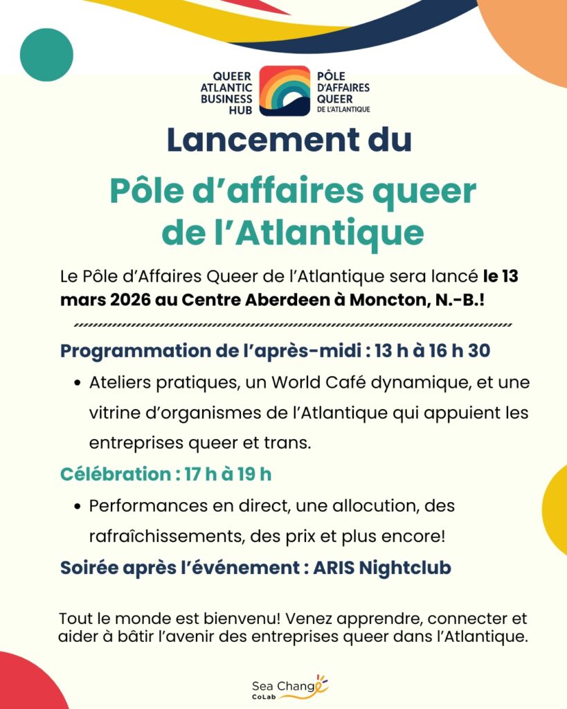 Préparez-vous, Acadie. Le Pôle d’Affaires Queer de l’Atlantique sera officiellement lancé le 13 mars 2026 au Centre Aberdeen à Moncton, N. B. Joignez-vous à nous de 13 h à 16 h 30 pour des ateliers pratiques qui explorent l’entrepreneuriat queer, stimulent de grandes idées lors d’un World Café dynamique et mettent en valeur des organisations atlantiques qui soutiennent les entreprises queer.
